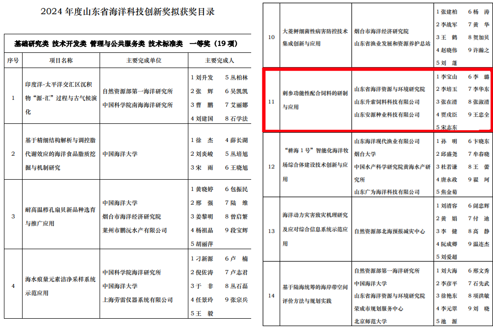 近日,山东省海洋局发布《关于2024年度山东省海洋科技创新奖获奖成果和人选的公告》,点点官网登录网址直属企业山东升索饲料科技有限公司与山东省海洋资源与环境研究院、山东安源种业科技有限公司合作完成的“刺参功能性配合饲料的研制与应用”项目荣获一等奖。